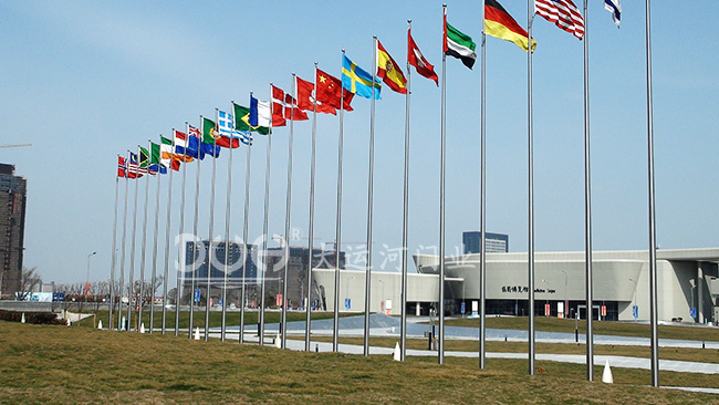 大运河门业的电动锥形旗杆材质选用南韩蒲项不锈钢304材料,从旗杆顶部到底端整体卷接成锥型,自动焊接,威严美观。杆体采用不锈钢横向拉丝板,整体壁厚3.0㎜,抗风性能好。内置式旗杆通过定制的手摇装置,控制旗帜的上下升降,而旗绳则隐藏在旗杆内部(专利),旗绳选用钢丝绳,使用年限长久。旗杆顶部配有不锈钢装饰球。通过特制的装置,旗帜可随风向360度顺风旋转,在风向任意变动下,旗帜都不会缠绕在旗杆上。